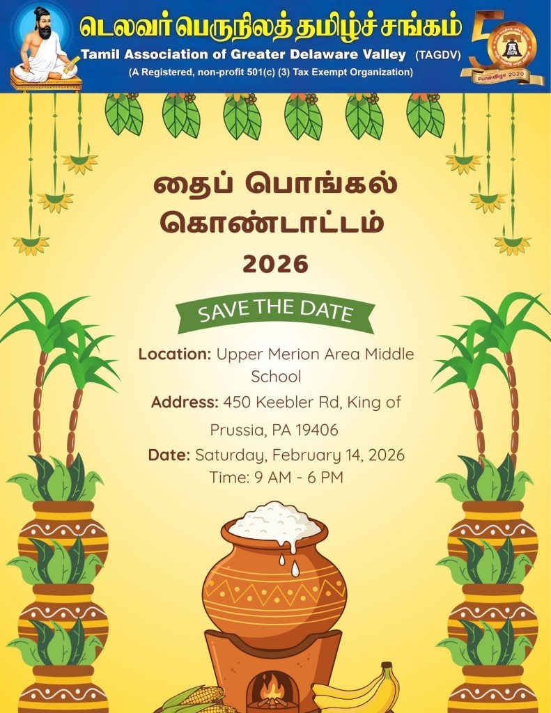 The Tamil Association of Greater Delaware Valley (TAGDV) is delighted to invite you and your family to our Thai Pongal Kondattam 2026. Your presence will add even more significance to this delightful celebration that brings together Tamil culture, tradition, harvest joy, and community unity.”