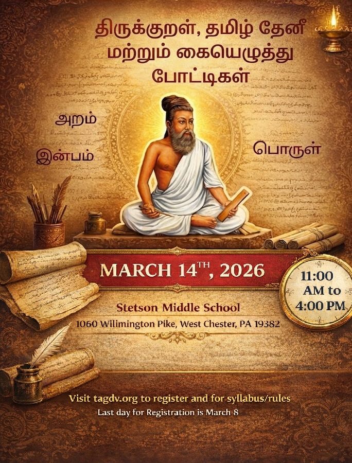 வணக்கம் TAGDV குடும்பத்தினர் மற்றும் அன்பு நண்பர்களே, TAGDV இல் வரவிருக்கும் தமிழ் போட்டிகள் இன்னும் உற்சாகமடையப் போகின்றன என்பதை அறிவிப்பதில் நாங்கள் மிகுந்த மகிழ்ச்சியடைகிறோம்! புகழ்பெற்ற திருக்குறள் மற்றும் தமிழ்த்தேனீ போட்டிகளுடன் சேர்த்து, தமிழ் கையெழுத்துப் போட்டி இந்த ஆண்டு ஒரு புதிய போட்டிப் பிரிவை பெருமையுடன் [...]